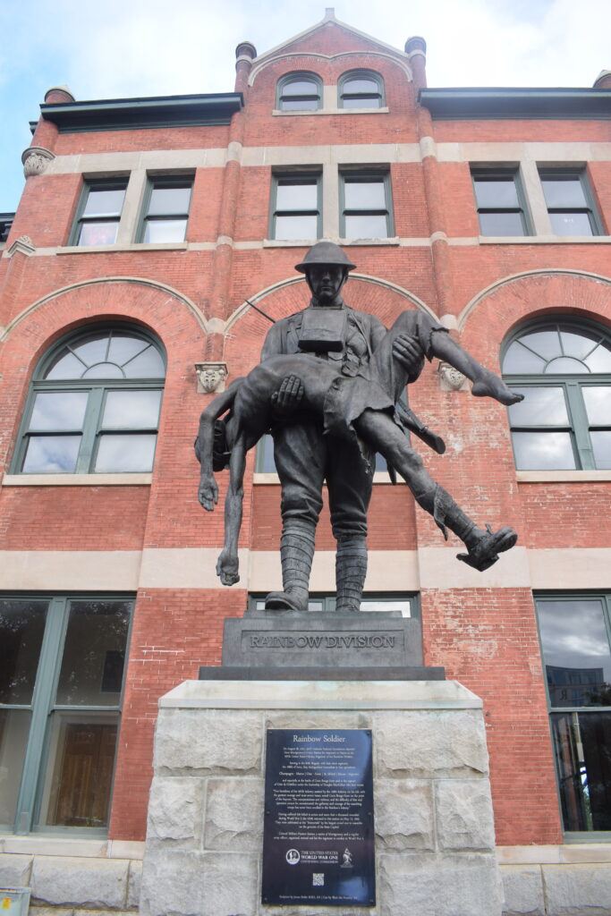 One of the most striking finds was the Rainbow Soldier statue, standing watch outside the station. Cast in bronze, it honors the Rainbow Division of WWI and catches you off guard with its raw emotion — a soldier carrying a fallen comrade. It’s the kind of memorial you don’t just look at; you feel it.